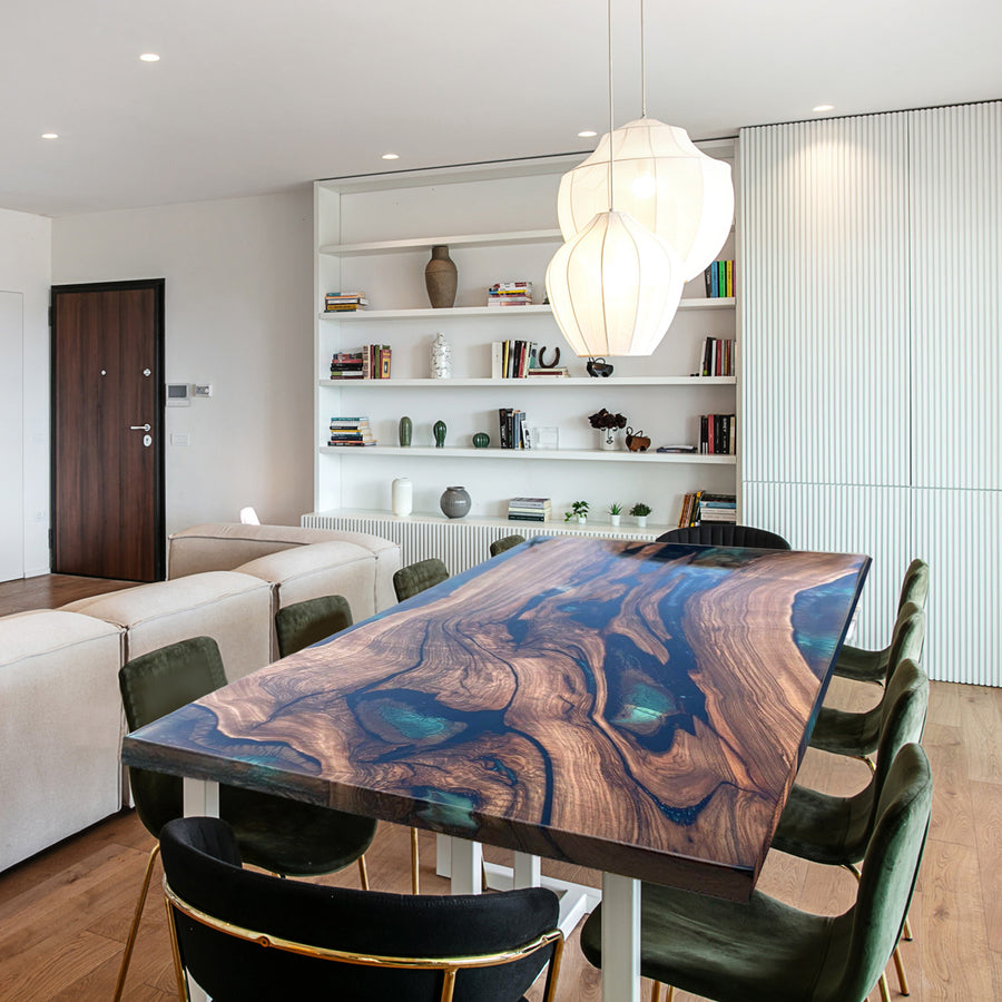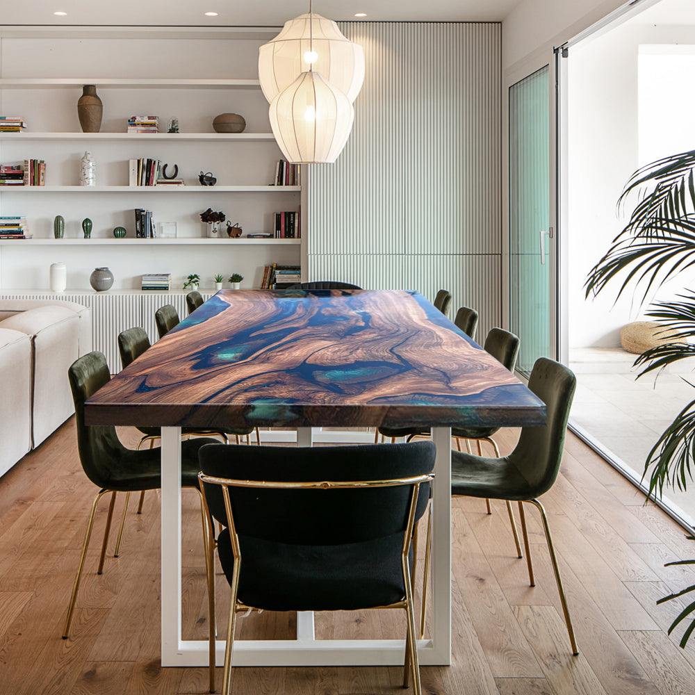 The Custom Black Walnut Epoxy River Table CRT-101 features premium black walnut wood combined with an epoxy river design, showcasing the perfect blend of nature and modern craftsmanship. The rich tones and unique grain patterns of the walnut are complemented by a customizable epoxy river, offering a visually striking effect. Whether used as a dining table or a decorative centerpiece, this table adds both functionality and artistic flair to any living space.