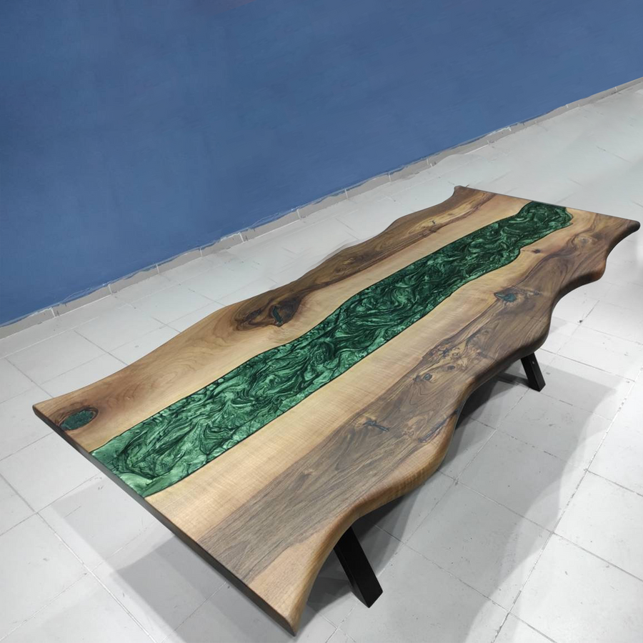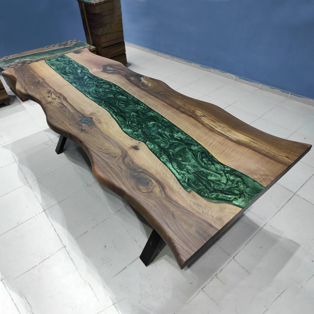 • Green Epoxy Resin River: A vibrant green epoxy resin is skillfully poured between the live edges of the walnut slab, creating a stunning river effect. The translucent resin mimics the flow of water, adding a dynamic contrast to the dark walnut wood.