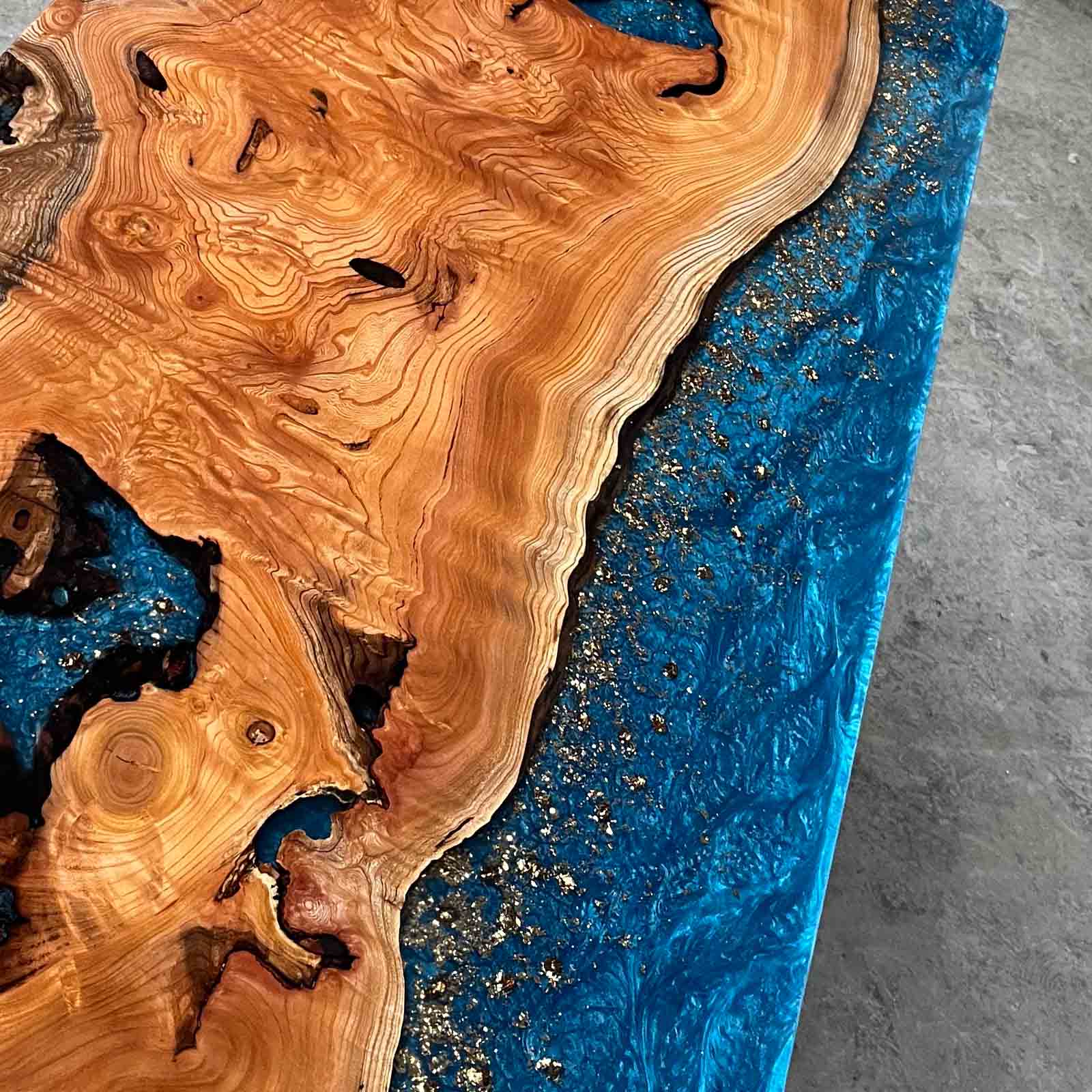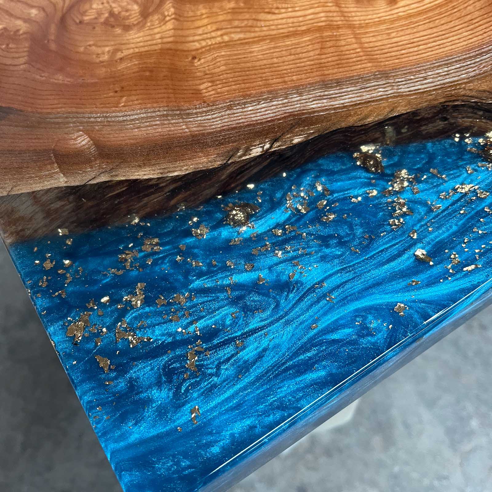 Crystal-clear blue epoxy combined with hand-laid gold leaf creates depth, movement, and a luxurious visual rhythm.