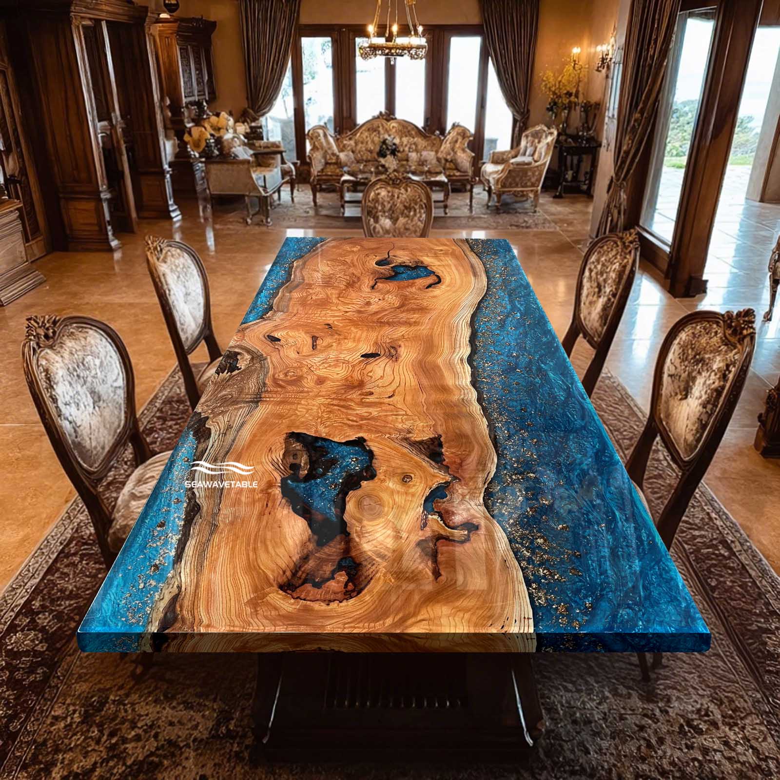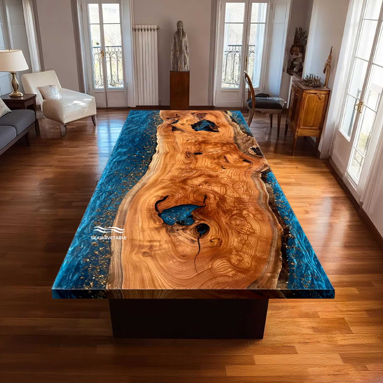 Seawavetable- Texas luxury blue resin art table made from solid beech wood