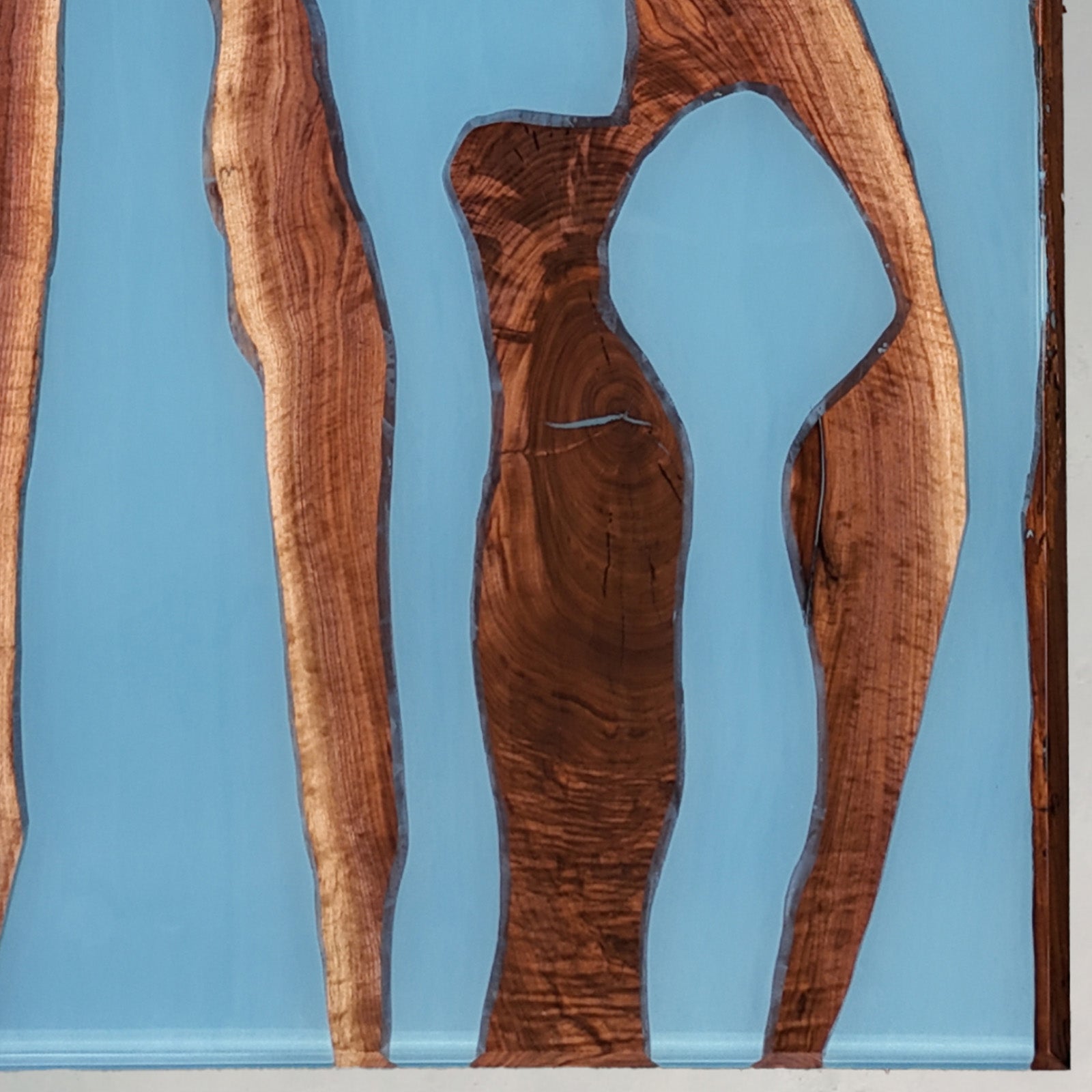 Inspired by Honolulu’s tropical resort aesthetic, this piece blends art-gallery-level design with functional furniture craftsmanship. The soft blue resin contrasts beautifully with the deep walnut grain, creating a visual rhythm reminiscent of ocean currents weaving through coastal cliffs. The irregular epoxy channels and negative spaces give the table a sculptural quality—perfect for luxury resorts, beachfront villas, modern coastal homes, and statement interior spaces.