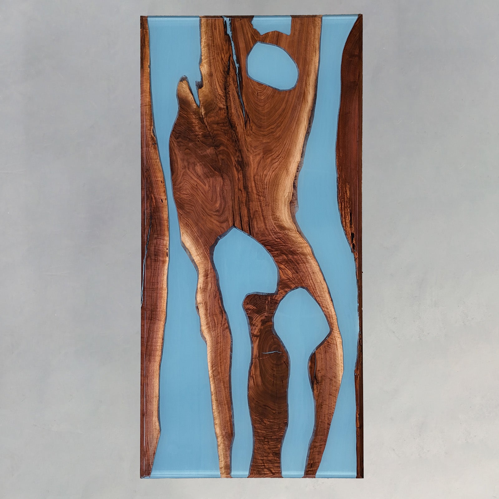 Sky blue epoxy resin table with natural black walnut wood slabs