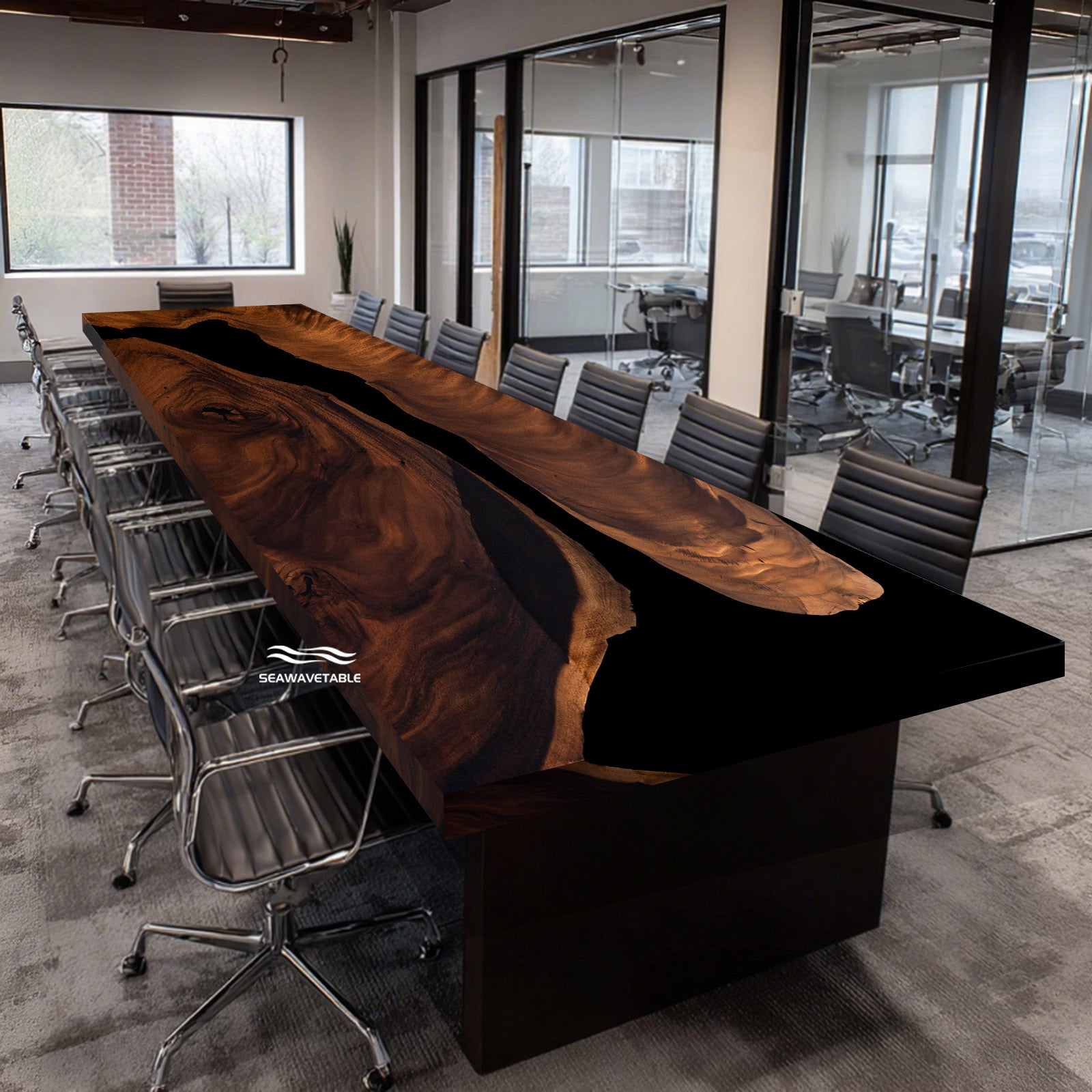 Custom Oversized Walnut Black Epoxy Boardroom Table with Built-In Power Ports CRT-241