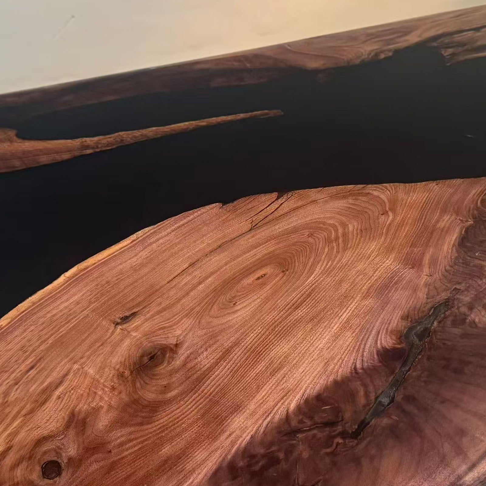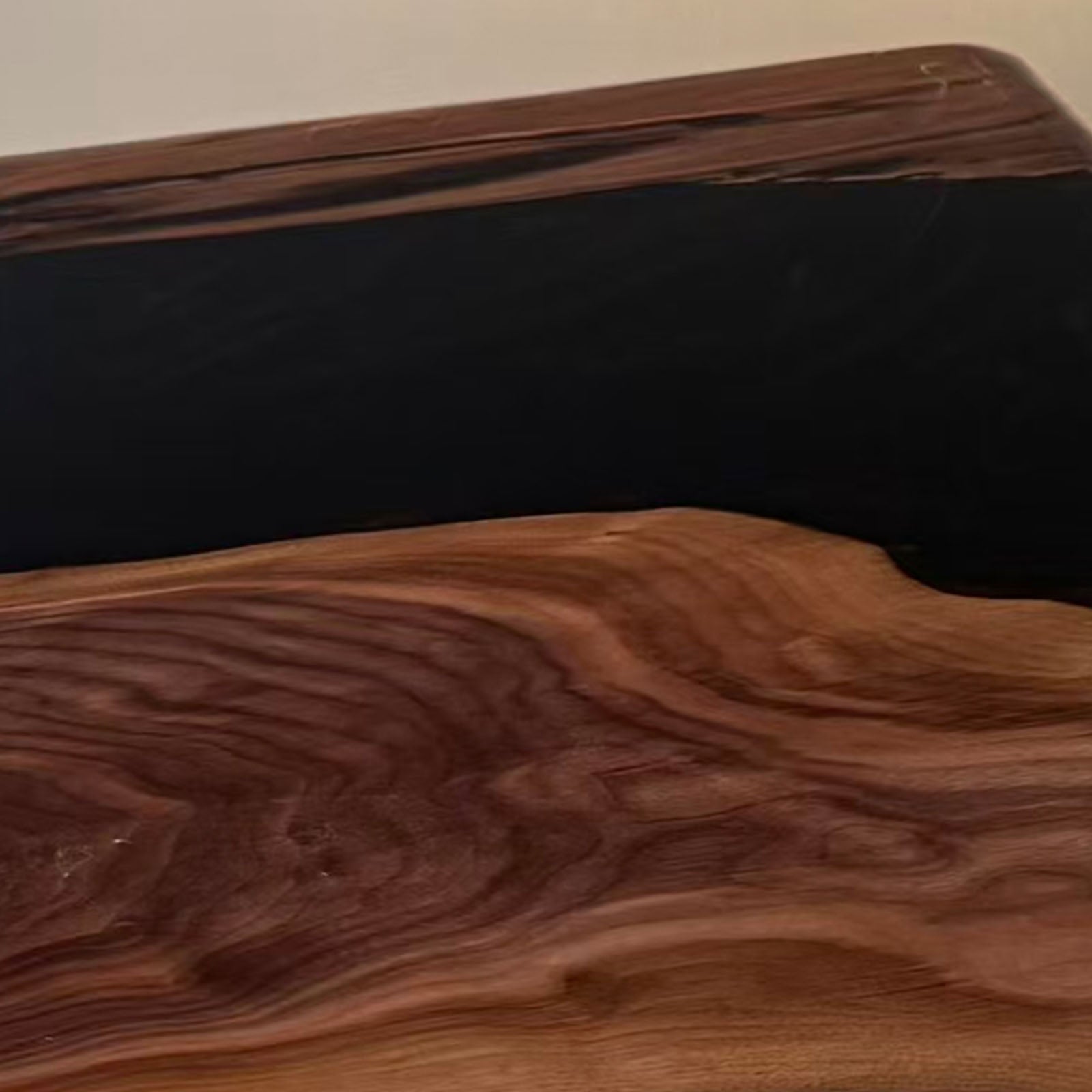 Unique irregular black resin distribution between two slabs of authentic black walnut.