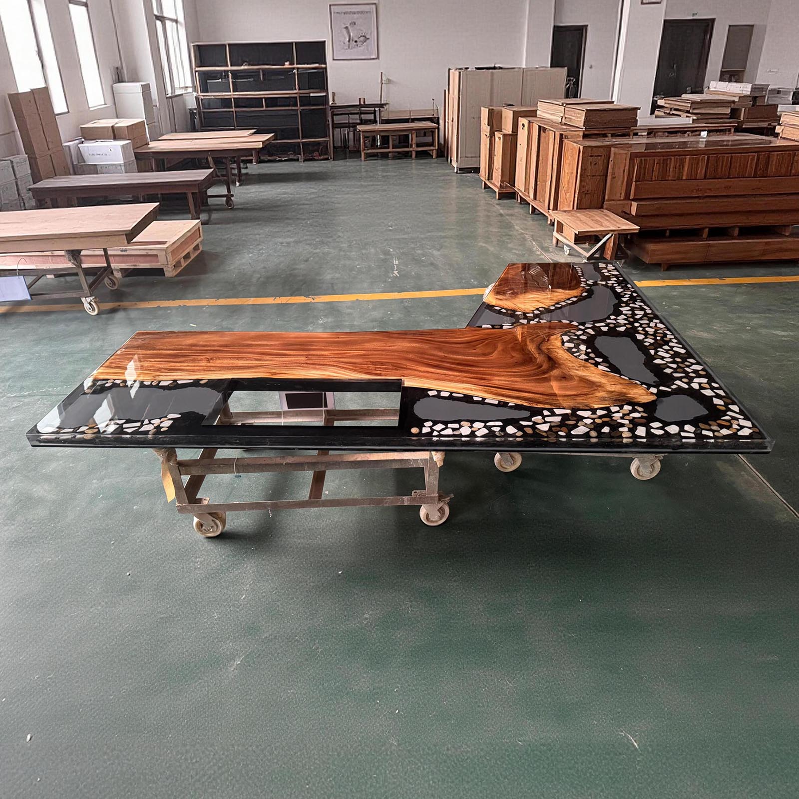 Glossy walnut L-shaped resin kitchen countertop with stone inlay, custom handcrafted design