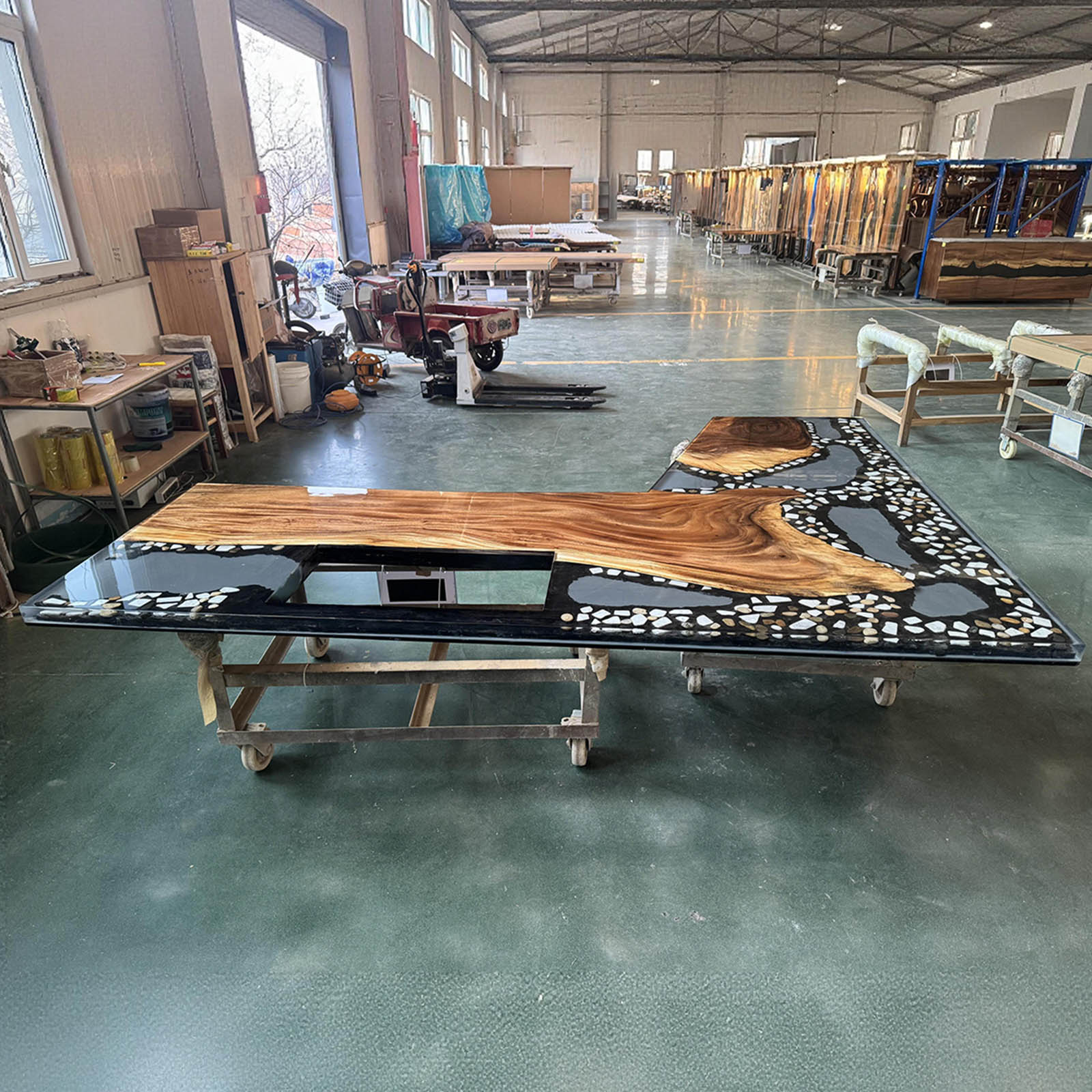 Designed specifically for L-shaped kitchen layouts, this resin walnut countertop offers both visual impact and everyday practicality. The flowing resin and embedded stone details create a striking contrast against the deep walnut tones, making the countertop a true centerpiece in modern kitchens, luxury homes, and architect-designed interiors.