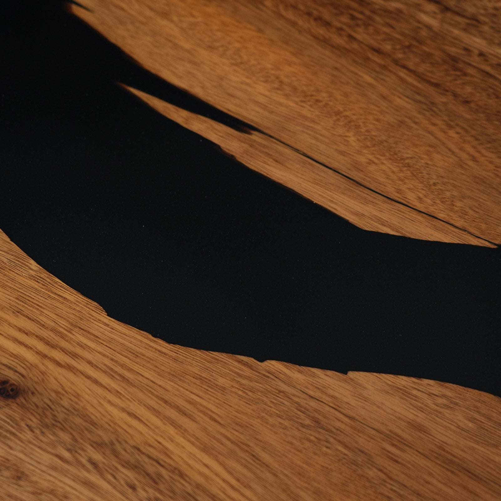 • Black Epoxy River Design – The modern black epoxy pour enhances the table’s bold contrast and creates a sophisticated, timeless centerpiece.