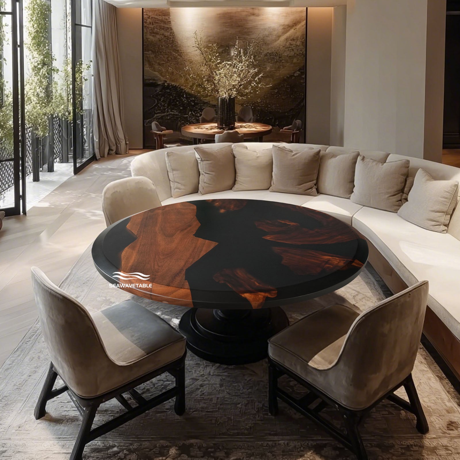 Designed for interiors that value clean geometry, high-end materials, and timeless sophistication, this table blends natural warmth with urban minimalism. The circular form creates visual balance, while the dark epoxy delivers a powerful, sculptural presence—making it an ideal centerpiece for luxury dining rooms, executive offices, and modern loft spaces.