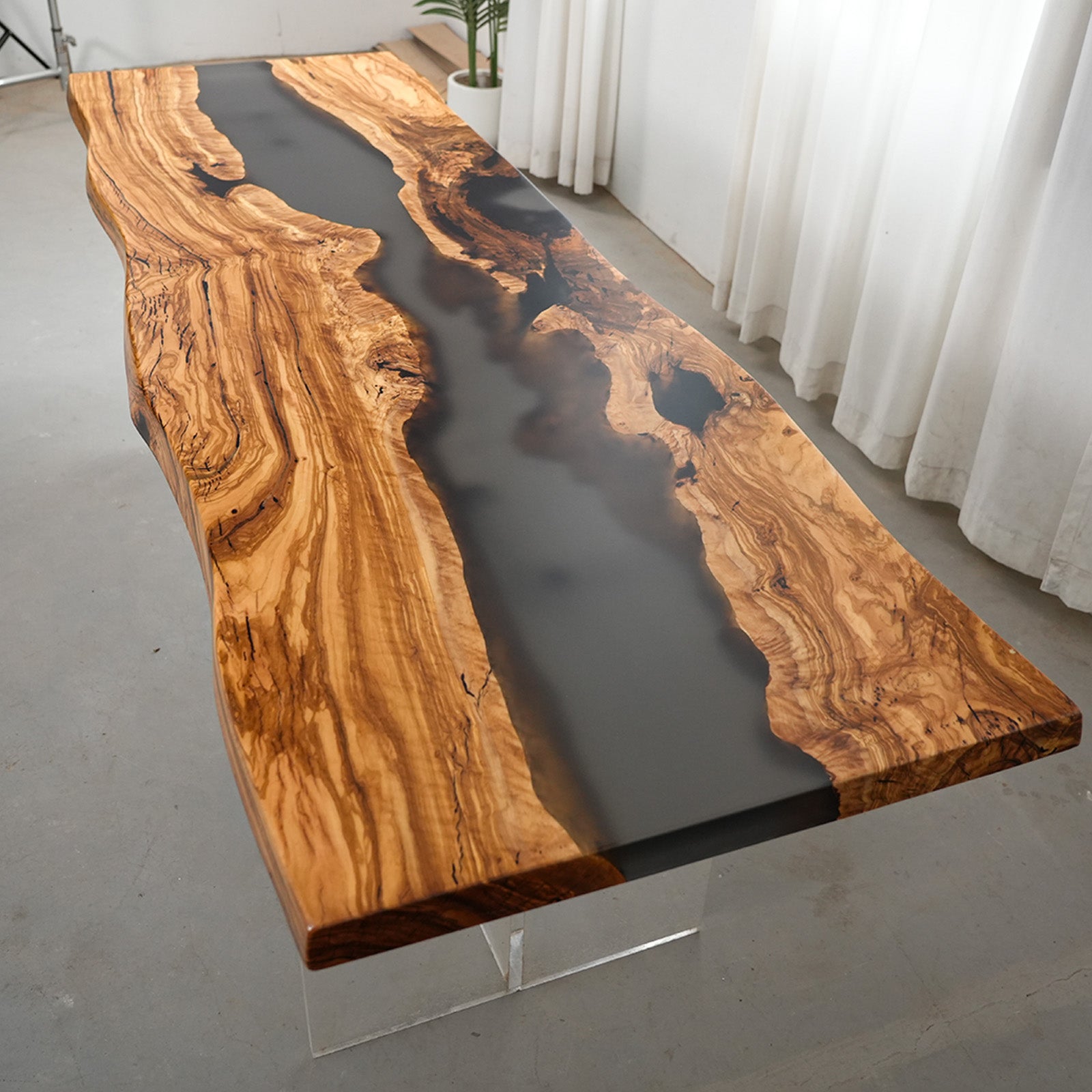 High-end walnut meeting table with semi-transparent black epoxy and live edges