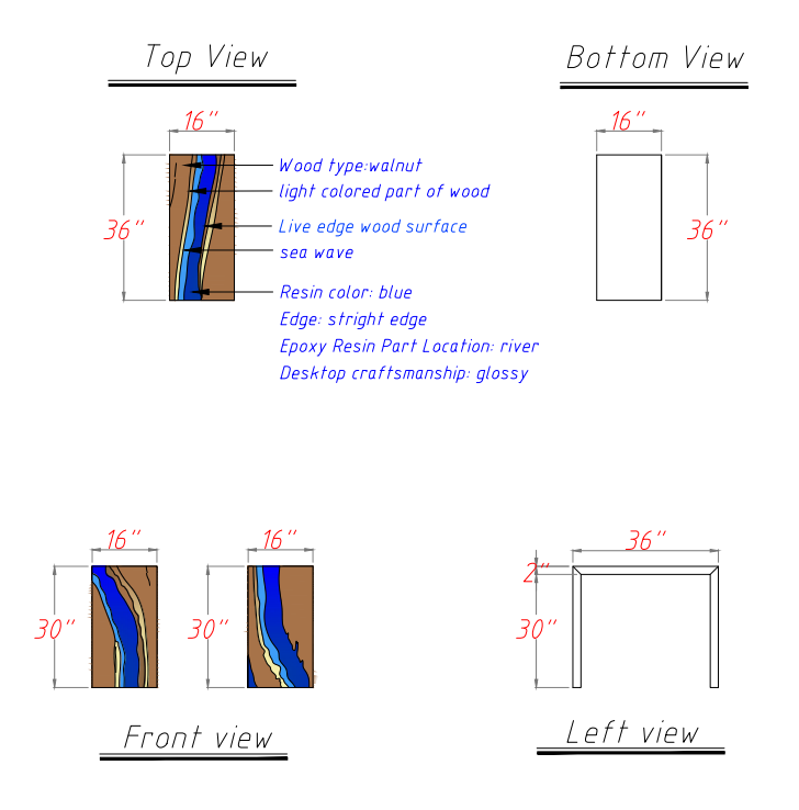 You can personalize your table by choosing your preferred wood type, size, resin color, edge style, and transparency. If you're unsure about any options, please click on our buying guide for assistance. Alternatively, you can select "AS SHOWN" to choose the same attributes as the first reference image for a ready-made option.