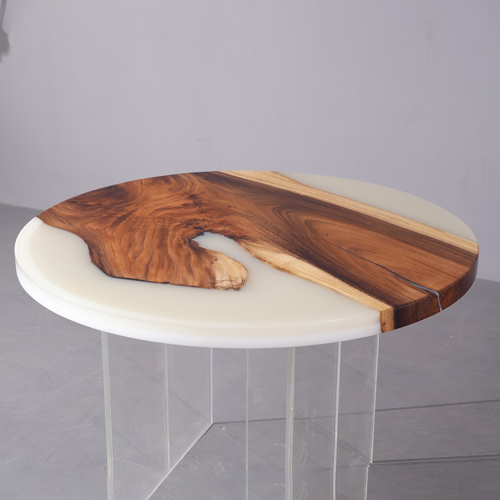 Artisan-made round walnut resin table in modern living room setting