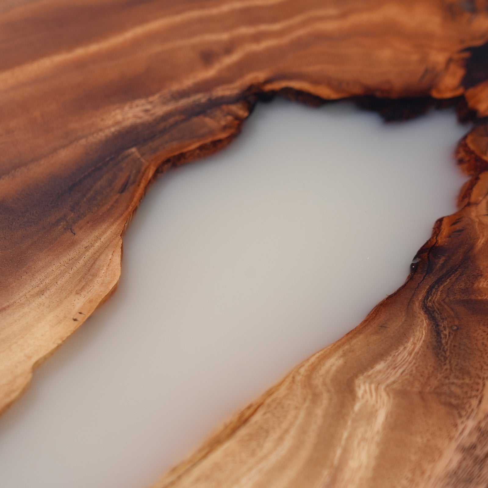 Close-up of Lunar Silk white resin blending with rich walnut wood grain