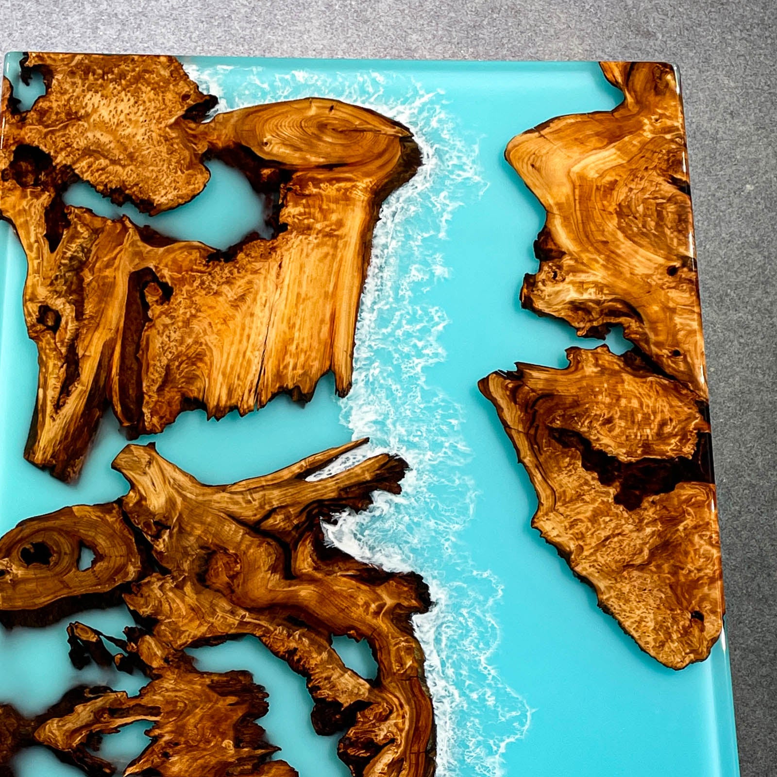 We are committed to preserving every knot, crack, and natural mark in the wood to showcase its authenticity and beauty, while avoiding excessive design elements. Ultimately, the most beautiful designs are shaped by time and nature. Therefore, the final product will not only retain the elements from the reference image (such as waves and broken islands) but also incorporate its own unique features, making each piece special and one-of-a-kind.